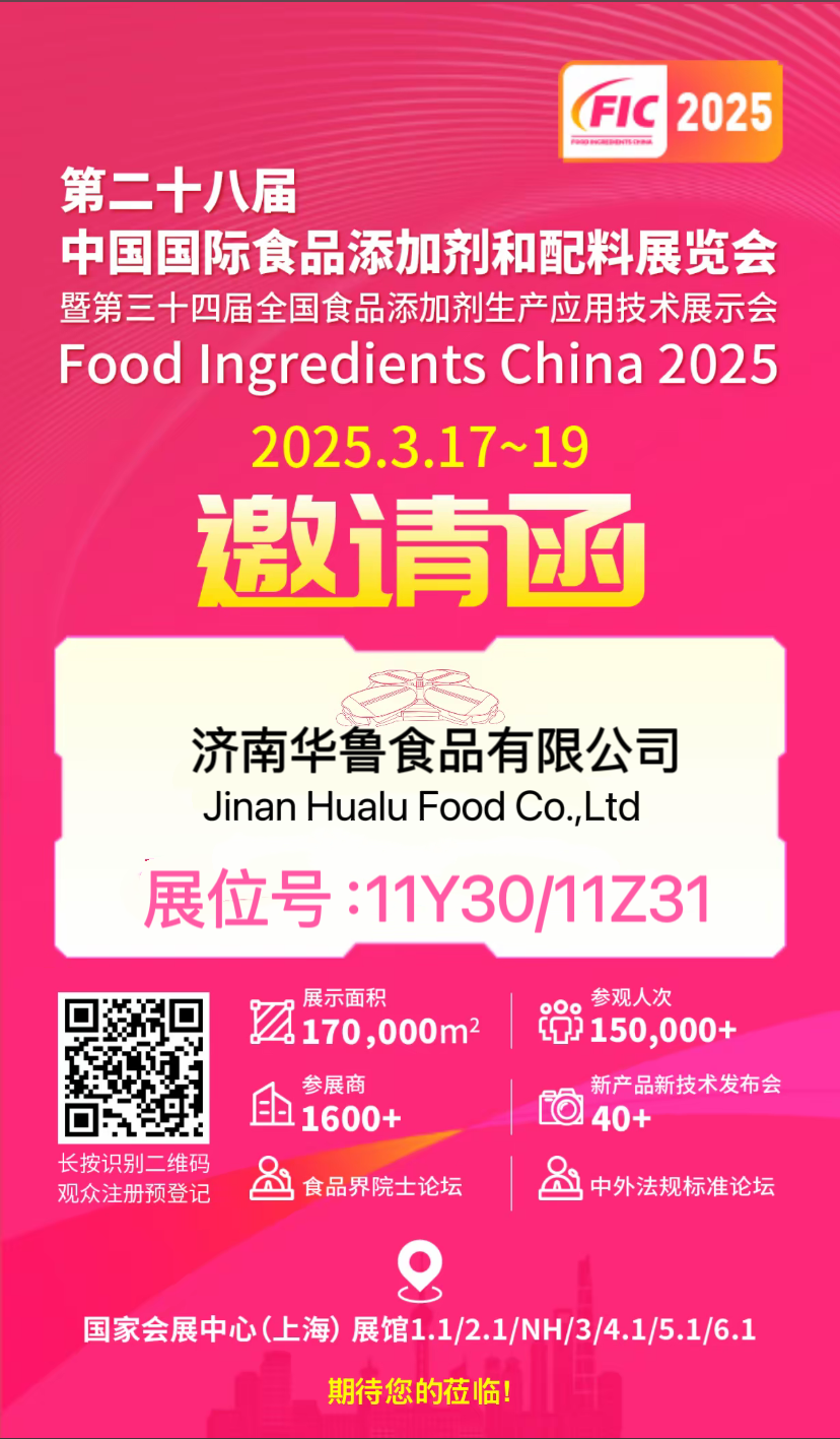 第二十八屆中國國際食品添加劑和配料展會(huì ),將于2025.3.17-19號在上海國家會(huì )展中心舉行,濟南華魯食品有限公司展位號:11Y30/11Z31,期待您的蒞臨!